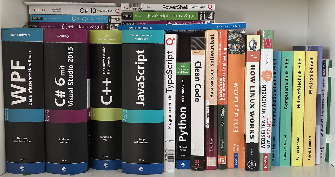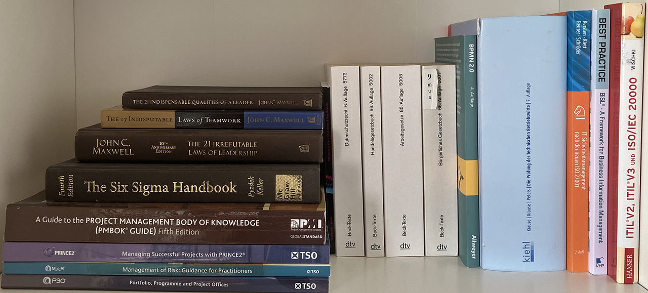 Ich verfüge über eine Bibliothek aus den beiden Feldern BWL: Projektmanagement und MINT: Software- und Hardwareentwicklung und bilde mich in diesen Gebieten weiter um eine noch bessere Leistung liefern zu können.