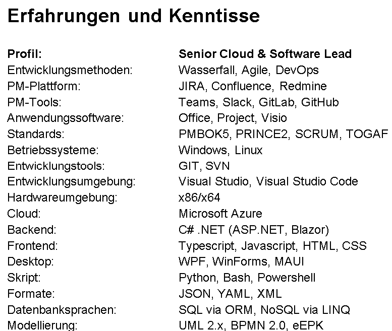 Seit >20 Jahren bewege ich mich ausschließlich im Microsoft-Ökosystem: .NET, C#, Typescript, GitHub, Azure – durch integrative Effekte potenziert sich die eigene Effizienz. Weniger Probleme, mehr Stabilität. Mainstream-Tauglichkeit und solider Support. Ich kenne mich Start-to-End und Top-to-Bottom in meinem Gebiet und mit meinen Tools aus – kontaktieren Sie mich noch heute für eine Leistung aus IT-Beratung, IT-Entwicklung oder IT-Projektmanagement.